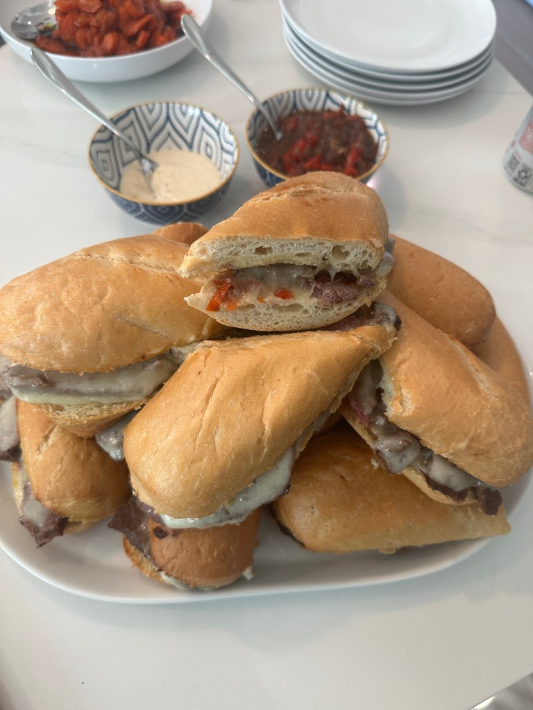 - Assemble the sandwiches with the aioli, onions, peppers, steak, and provolone.